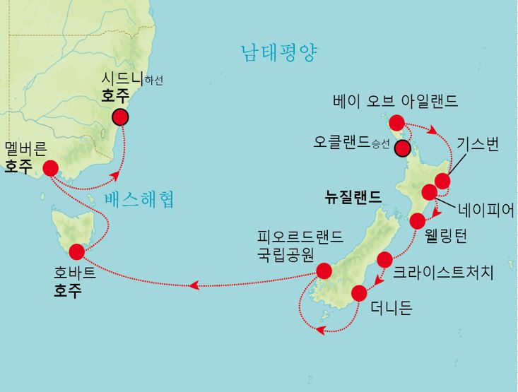 인천-기내박(1)-오클랜드-베이오브아일랜드-기스번-네이피어-웰링턴-크라이스트처치-더니든-멜버른-호바트-시드니-인천