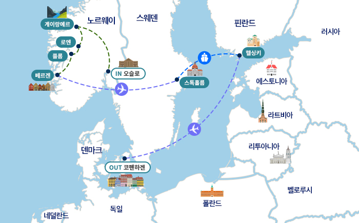 인천-암스테르담(1)-(항공이동)-오슬로(1)-릴레함메르-게이랑에르(1)-브릭스달-로엔(1)-송네피오르-플롬-베르겐(1)-(항공이동)-스톡홀름(1)-실야라인 크루즈(1)-헬싱키-(항공이동)-코펜하겐(1)-암스테르담(경유)-기내(1)-인천